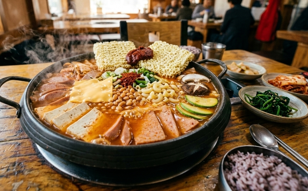 부대찌개는 얼큰한 국물과 다양한 재료가 어우러진 음식으로, 한국 사람들에게 매우 친숙한 메뉴다. 햄과 소시지, 김치, 두부 등