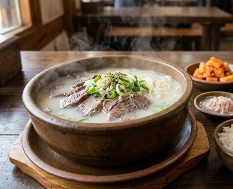 뽀얗고 깊은 국물 맛은 한국 전통 음식의 정성과 시간을 잘 보여 줍니다.