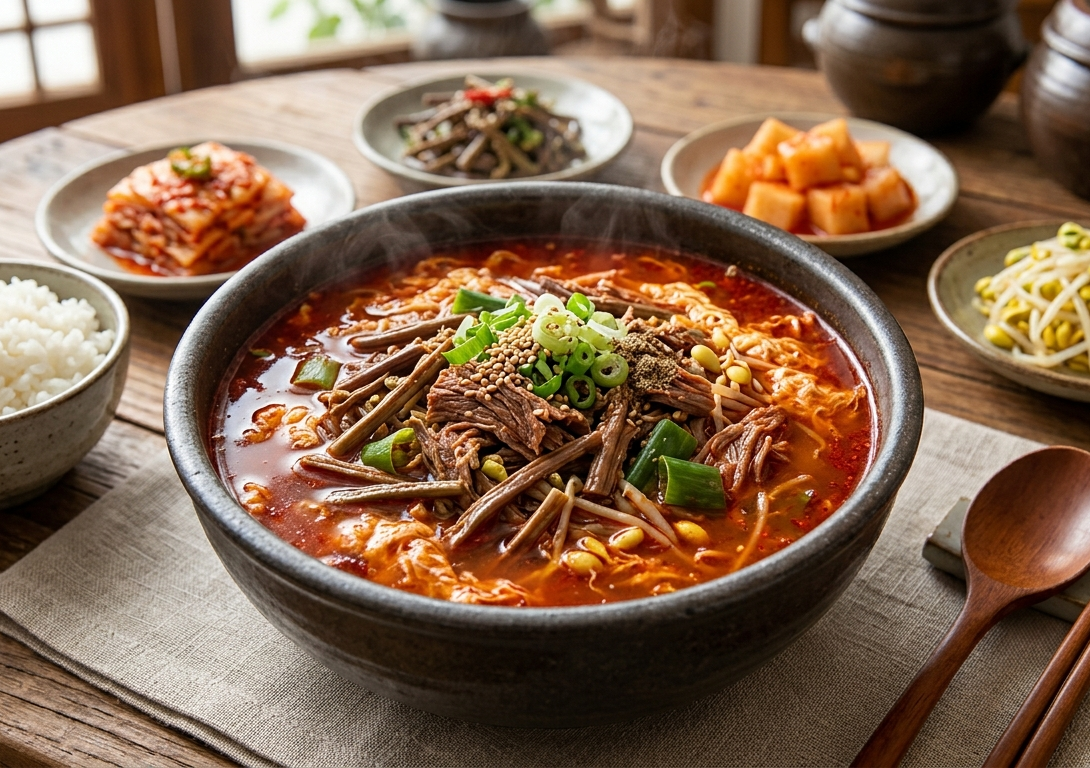 육개장은 단순히 매운 국이 아니라 여러 재료가 어우러져 층층이 맛을 내는 한국식 국물 요리의 정수를 보여주는 음식이라 할 수 있다.