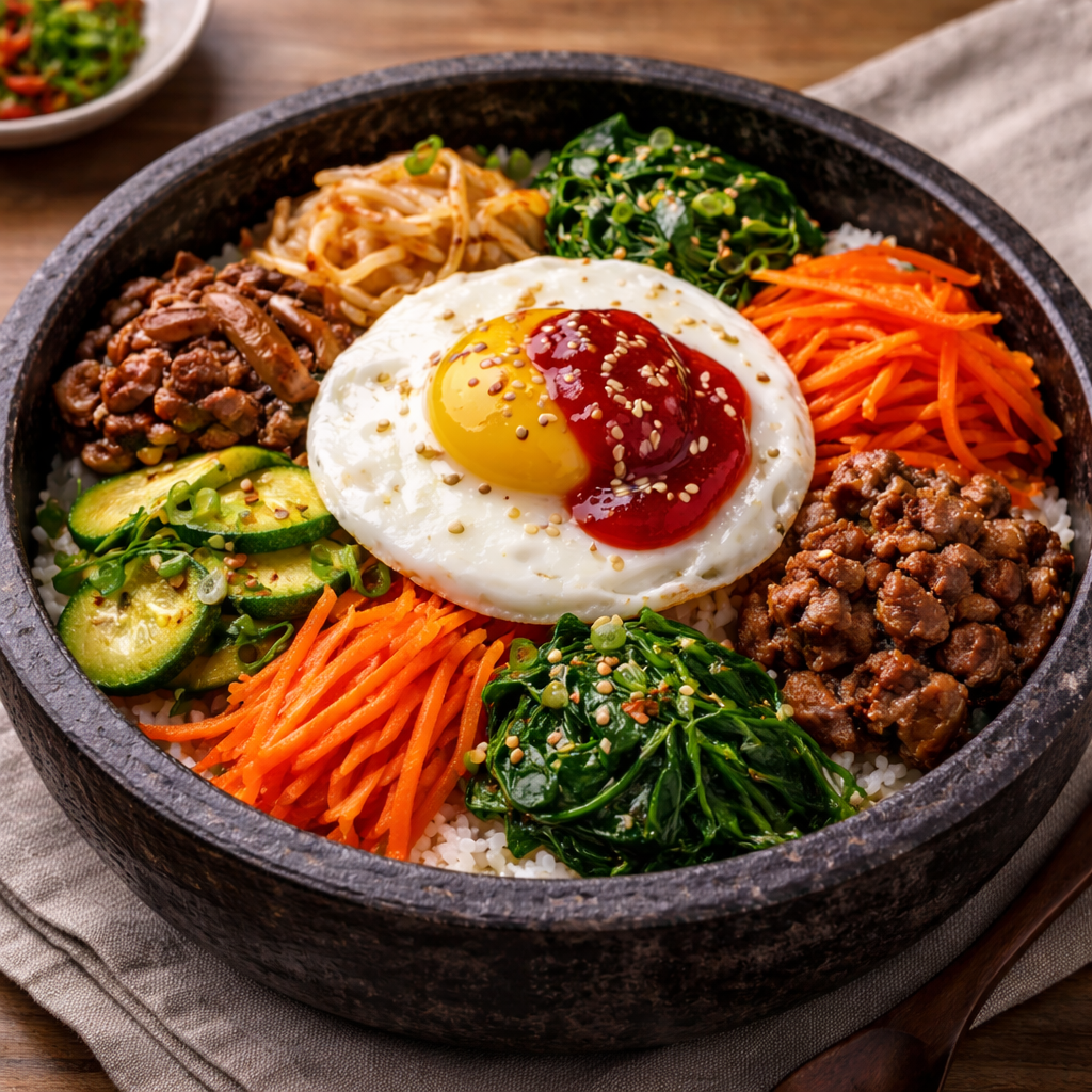 비빔밥은 여러 가지 채소가 함께 들어가기 때문에 영양 균형이 좋은 음식입니다. 당근, 시금치, 콩나물, 버섯 같은