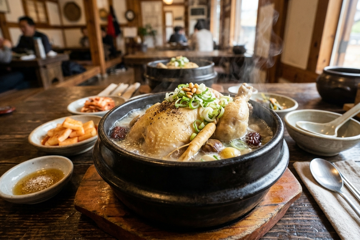 닭 속에는 찹쌀, 인삼, 대추, 마늘 등이 들어가며 이 재료들이 함께 끓여지면서 깊은 맛의 국물이 완성됩니다.