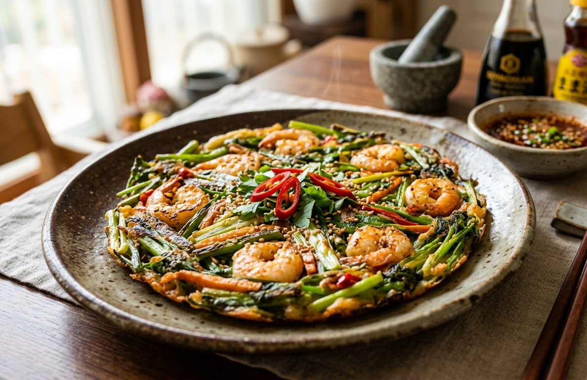 미나리는 특유의 향긋함으로 많은 사람들에게 사랑받는 식재료다. 이 향은 입맛을 돋우는 역할을 하며, 기름에 부쳤을 때 더욱 진하게 살아난다. 여기에 단백질과 감칠맛이 풍부한 새우가 더해지면 맛의 균형이 완벽하게 맞춰진다. 하지만 이 요리의 진짜 핵심은